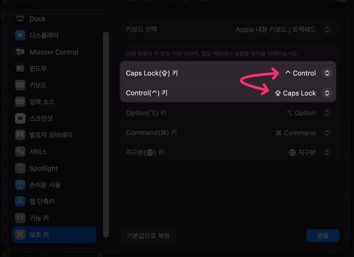 - 맥 설정 > 키보드 > 키보드 단축키 > 보조키로 이동