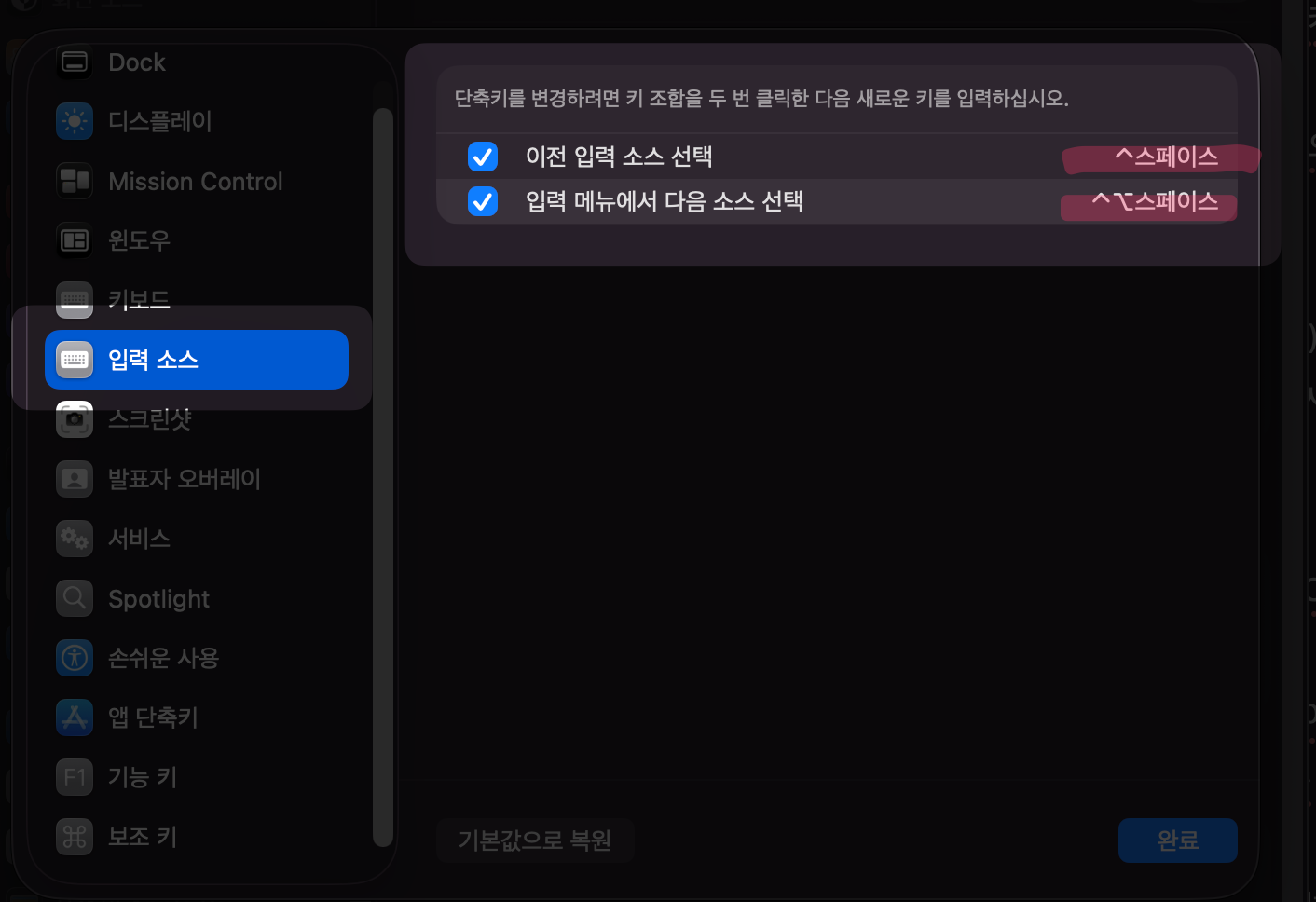 - 시스템 > 키보드 > 단축키를 수정한다