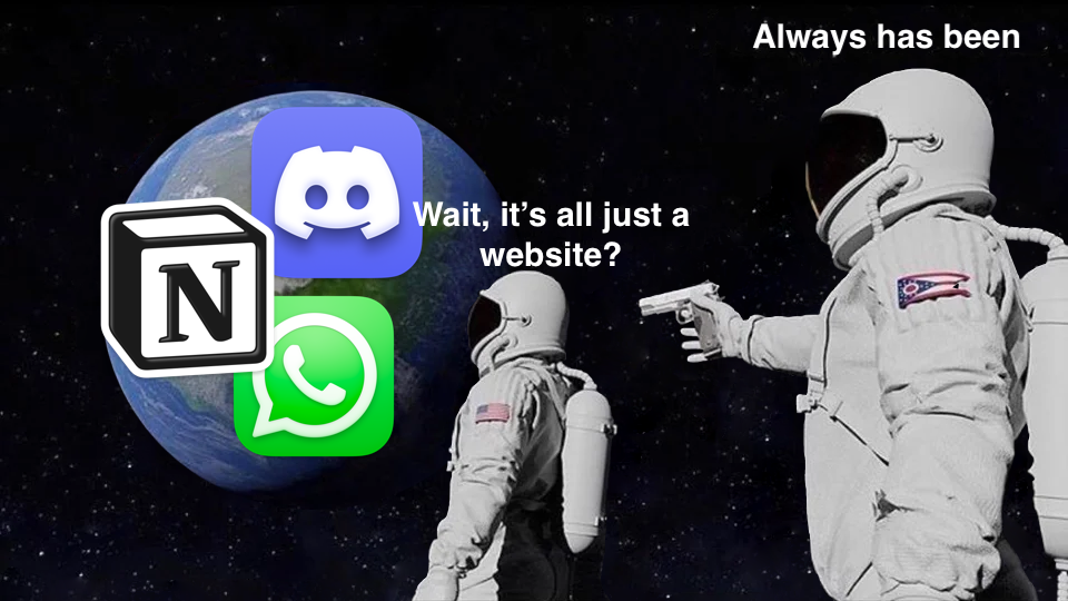 Electron 프레임워크를 쓰면 Chromium 엔진을 기반으로 데스크탑 앱을 만들 수 있어서 하나의 코드베이스로 윈도우, 맥, 리눅스 버전 앱을 만들 수 있다 보니 2020년도 이후 정말 범람하듯 데스크탑 앱이 쏟아졌고, 이러한 앱들이 업무와 삶 다방면에 파고들었다.